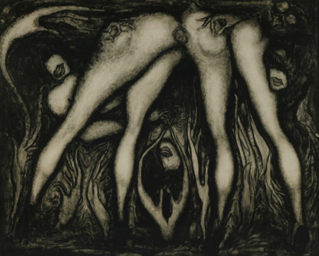 Несмотря на отсутствие чёткого объекта эротической фиксации, аналогичный эффект выхода в область сакрального за счёт нарушения целостности тела (вплоть до его полного устранения) можно наблюдать в работах греческого художника Йоргоса Лазонгаса (1945-2022), выполненных в авторской технике «слепой живописи». Суть этой техники заключалась в утрате авторского контроля над конечным результатом за счёт посредничества чёрной угольной бумаги между художником и чистым листом. Эротическое в целом и эротическая связь в частности являются одним из центральных мотивов в творчестве Лазонгаса. По собственному признанию, художник не мог творить с моделью, с которой у него не было эротической связи — телесной и идеологической [Λαζόγκας 1987; 69]. Так в его слепых работах на бумаге женское тело искажается: одни фрагменты налезают друг на друга, в то время как другие остаются невидимыми. Это наложение отчасти напоминает Беллмеровское; однако в то время как для Беллмера фантазийное лежит в визуальной сфере, задачей Лазонгаса в первую очередь является передача тактильного опыта через визуальное. Греческий художник утверждал, что его рисунки представляют собой скорее «следы рисунков», определяя след как «всё, что отпечатывается на поверхности» [Λαζόγκας 1987; 65]. Особый интерес вызывают слепые работы Лазонгаса на простынях: холстом становится пространство занятия любовью, а проводником в сакральное — не само тело, а оставленные им следы. «Страсть, которая не теряется. Проживаемые прикосновения, присутствия, женские тела и конечности, мужские фрагменты, разделённые надвое, запечатлённые на простыне, разорванные бумаги, части тела, которые, живые, совершали таинства на полу и стенах, знаки некоего священного брака, следы на свадебном платье, ставшем марлевой повязкой. Эрос, необработанный камень, висящий в воздухе без визуального воплощения, коснёшься его, и он обретёт форму, ускользая от тебя, фигуры, пишущиеся одна поверх другой. Да, есть в этом трагическое, Эрос-Танатос…» [Λαζόγκας 1987; 72], — комментировал художник свой метод в интервью.