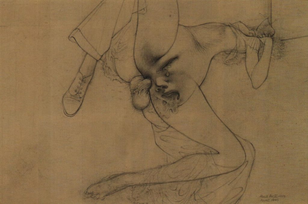 Одними из важных авторов для Беллмера, чьи работы он иллюстрировал, были Жорж Батай (1897-1962) и Маркиз де Сад. Дебютная повесть Батая, «История глаза» 1928-го года, представляет собой калейдоскоп обсессий и эротических фиксаций. Образ глаза появляется из сексуальных игр рассказчика и его подруги Симоны с яйцами: «А на что похоже яйцо? На телячий глаз из-за цвета головки, а кроме того, белок яйца — это белок глаза, а желток — зрачок. Форма глаза, по её словам — это форма яйца» [Батай 2017; 68]. Последующие мутации образа в размышлениях героини представляют собой обратный Беллмеровскому ассоциативный перенос и его наложение на эротизированную часть тела: «каждая её ягодица — очищенное крутое яйцо» [Батай 2017; 68]. Несмотря на обилие откровенных и шокирующих сцен, «История глаза» может скорее рассматриваться как произведение, обнажающее механику развития сексуальной фантазии или же эротического сновидения, нежели порнографическая провокация. Троица «яйцо—телячий глаз—ягодица» продолжает череду метаморфоз, не отменяющих свои предыдущие инкарнации, но дополняющих их. В одной из следующих сцен герои оказываются на корриде, и Симона, играя в промежности тестикулами убитого быка, наблюдает смерть матадора Гранеро в схватке со следующим зверем: «Правый глаз трупа — висел» [Батай 2017; 79]. Глаз теряет свою дискретность в череде ассоциаций и замещающих его образов — яиц, тестикул, ягодиц, урины, фетишистски пронизывающей всё повествование, а также сексуального удовольствия и смерти. В кульминации рассказа Симона требует вставить ей в задний проход глаз убитого героями священника, а рассказчик видит в извлечённом органе глаз «самой чистой и трогательной» [Батай 2017; 54] из подруг главных героев, Марсель, которую своей похотью они довели до безумия и суицида: «Мои глаза словно стали эректильными от ужаса: я увидел в волосатой вульве Симоны бледно-голубой глаз Марсель, смотревший на меня слезами урины» [Батай 2017; 87].