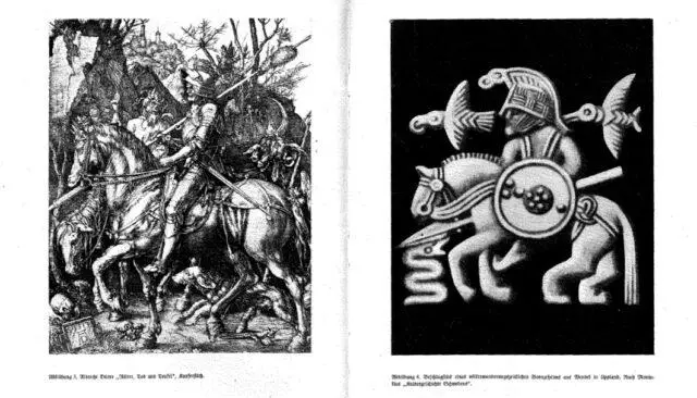 Другой рисунок являл женскую фигуру, летящую на некоем звере. Рог в руках женщины автор охарактеризовал как «символику луны» и богини Фригг. Если в академической науке подобные рисунки было принято считать чем-то вроде шуточных проделок строителей, то нацистские гуманитарии воспринимали их куда серьезнее. «Когда мы находим то, что не может быть объяснено в христианским ключе, мы должны искать истолкование в других, более глубоких источниках, в старой вере, которая хотя и была покорена, но далеко не умерла», — заявлял автор статьи, повествующей про находки в Шлезвигском соборе.